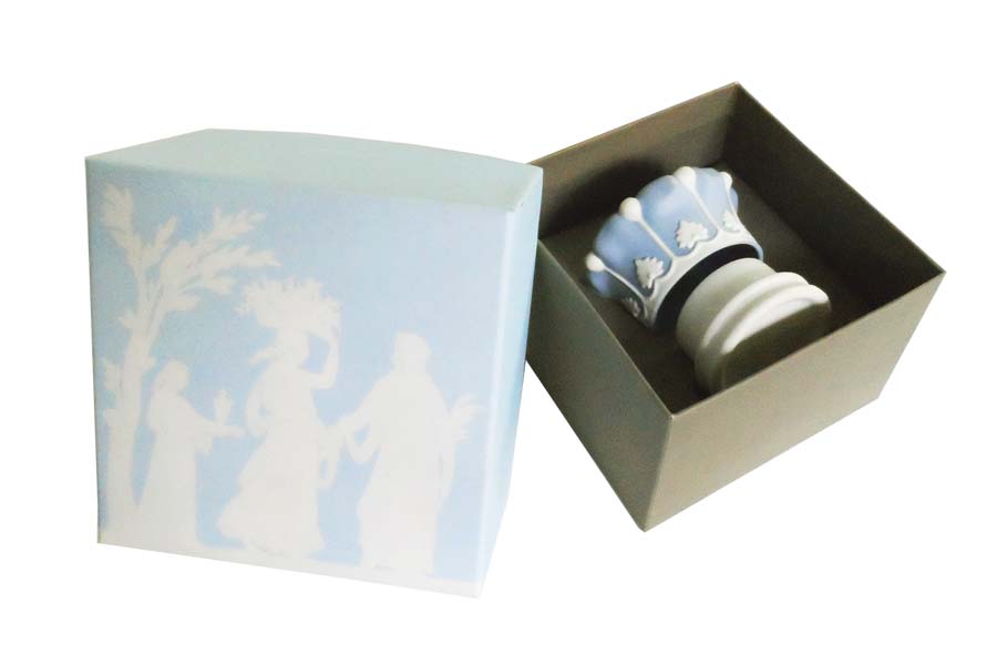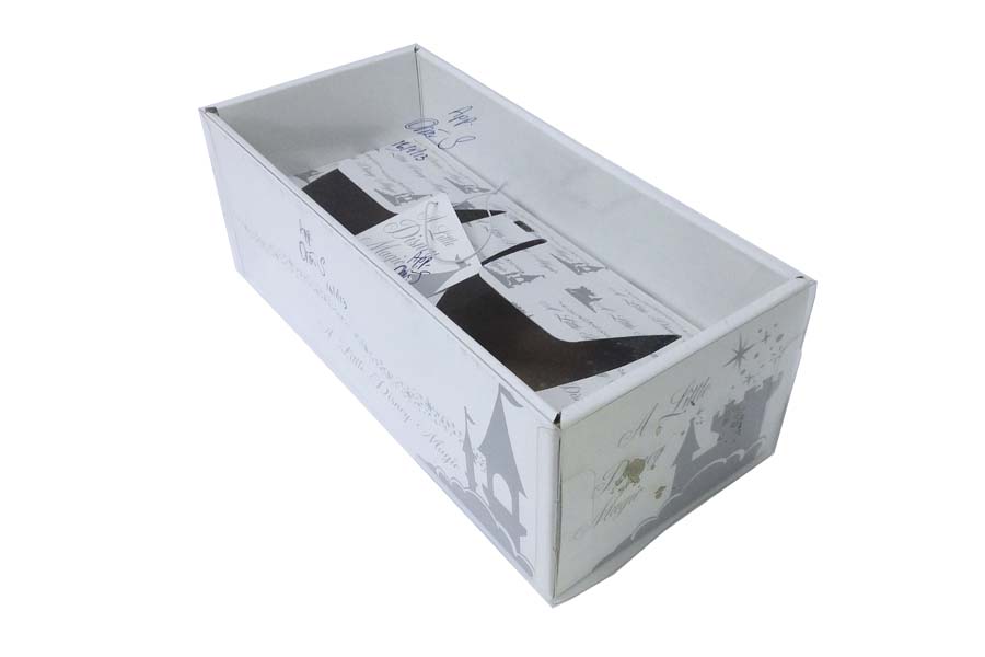 กล่องพิมพ์ออฟเซ็ทประกบกับกระดาษลูกฟูก เจาะหน้าต่างโชว์ตัวสินค้าและเจาะตาไก่ร้อยเชือกตรง เพิ่มความพรีเมี่ยมให้กับสินค้า.