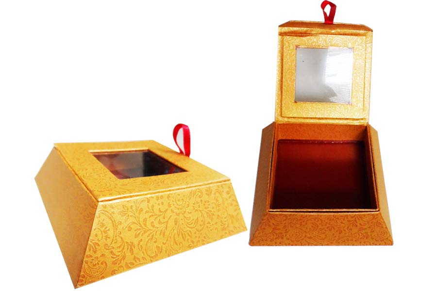 กล่องกระดาษแข็งจั่วปัง หุ้มด้วยใบพิมพ์ออฟเซ็ทผ่านการเคลือบเพื่อความสวยงามและปั้มKทองผูกริบบิ้นและเจาะหน้าต่างติดแผ่นพลาสติกpvcโชว์ตัวสินค้าเพิ่มความหรูหราให้สินค้า.