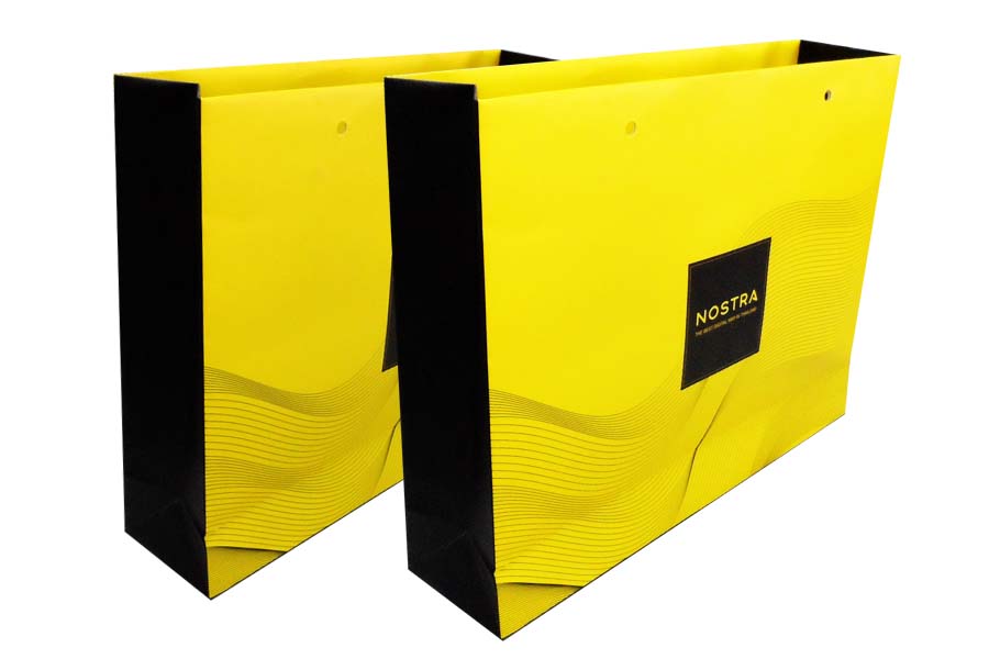 ถุงกระดาษ พิมพ์ออฟเซ็ทผ่านกระบวนการเคลือบเพื่อความสวยงามและทนทาน เจาะรูร้อยเชือกเหมาะกับสินค้าหลากหลายประเภท.